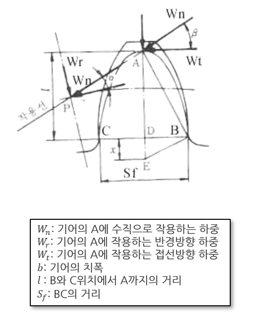 - 기어 치를 외팔보로 보면 접선방향의 하중 W_t 는 굽힘 모멘트가 발생시키고,이때 B점이 받는 굽힘 강도는 다음과 같이 계산함.