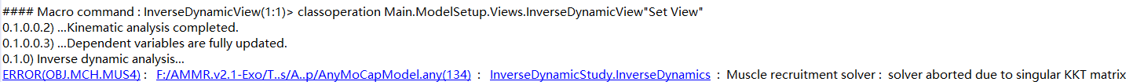 AnyBody Modeling System에서 Inverse dynamics를 수행할 때 종종 아래와 같은 에러 메시지가 발생하는 경우가 있습니다. "Musucle recruitment solver: Solver aborted due to singluar KKT matrix."