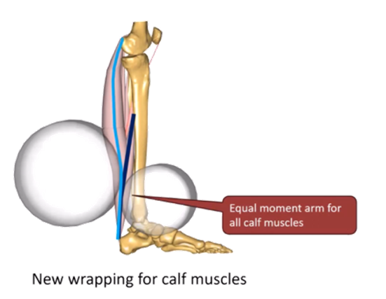 - 이전 버전에서 종아리 근육(파란색선)발꿈치로 이어질 때 관절 각도에 따라서 근육선이 뼈를 파고들거나 모멘트 암이 변하는 문제가 발생함.