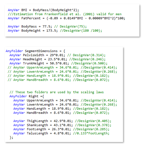 - LENGTHMASSFAT_EXTMEASUREMENTS: 체중과 각 세그먼트의 질량은 외관상 스케일링에 반영되며, 체중과 신장에 의해 계산되는 FatPercent(비만도)도 근력에 영향을 줌.