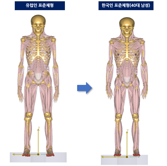 AnyBody에서 제공하는 근골격 인체모델은 모든 체형으로 변경이 가능합니다. 기본 모델은 유럽인 남성의 평균인 175cm, 75kg의 체형으로 모델링이 되어 있습니다. 물론 한국인 표준 체형으로도 스케일링이 됩니다.