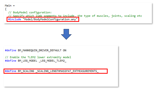Main 함수 내에 HumanModel 위에 BodyModelConfiguration.any 파일을 클릭하여 사용할 LENGTHMASSFAT_EXTMEASUREMENTS 기법을 정의(#define)합니다.