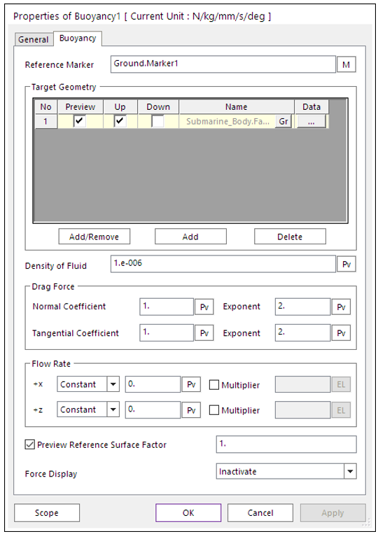 - Target Geometry : 부력을 받을 대상 물체를 지정하며, 부력이 작용하는 면을 지정.