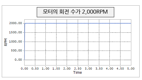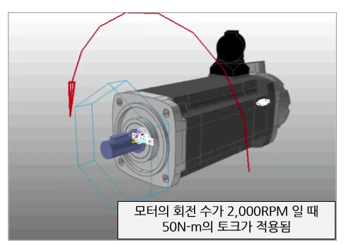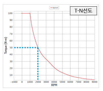 - 모터 특성 곡선에 따라 부하가 50N-m일때의 모터의 회전속도는 2,000RPM이 나타납니다.