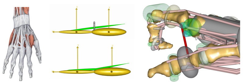 - 레겐스부르크 대학 생체역학 연구실과 울름 대학 생체역학 연구실의 공동 연구 프로젝트로 근육을 포함한 새로운 근골격 손모델을 개발하였습니다.
