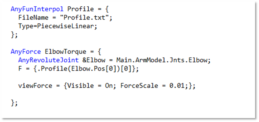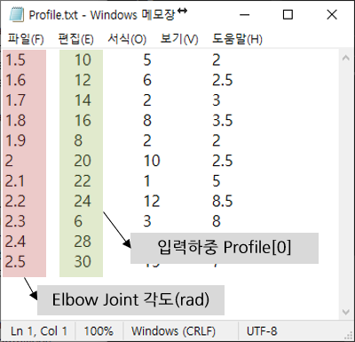 - AnyFunInterpol 클래스로 정의한 Profile 함수를 Elbow.Pos[0] 각도에 따라 값을 지정
