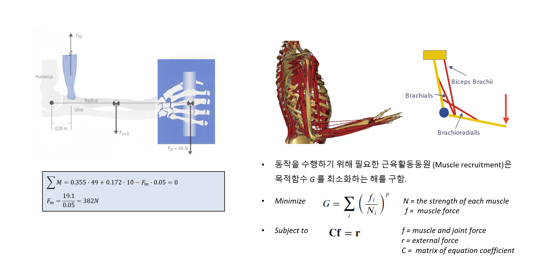 - 2차원 평면상에서 팔에 부착된 하나의 근육에 발생하는 힘은 단순 모멘트 평형식에 의해 쉽게 계산이 됩니다. 하지만 3차원상에서 복잡한 근육으로 이루어진 실제 인체모델에서 근육의 힘을 계산하기는 매우 어렵습니다.