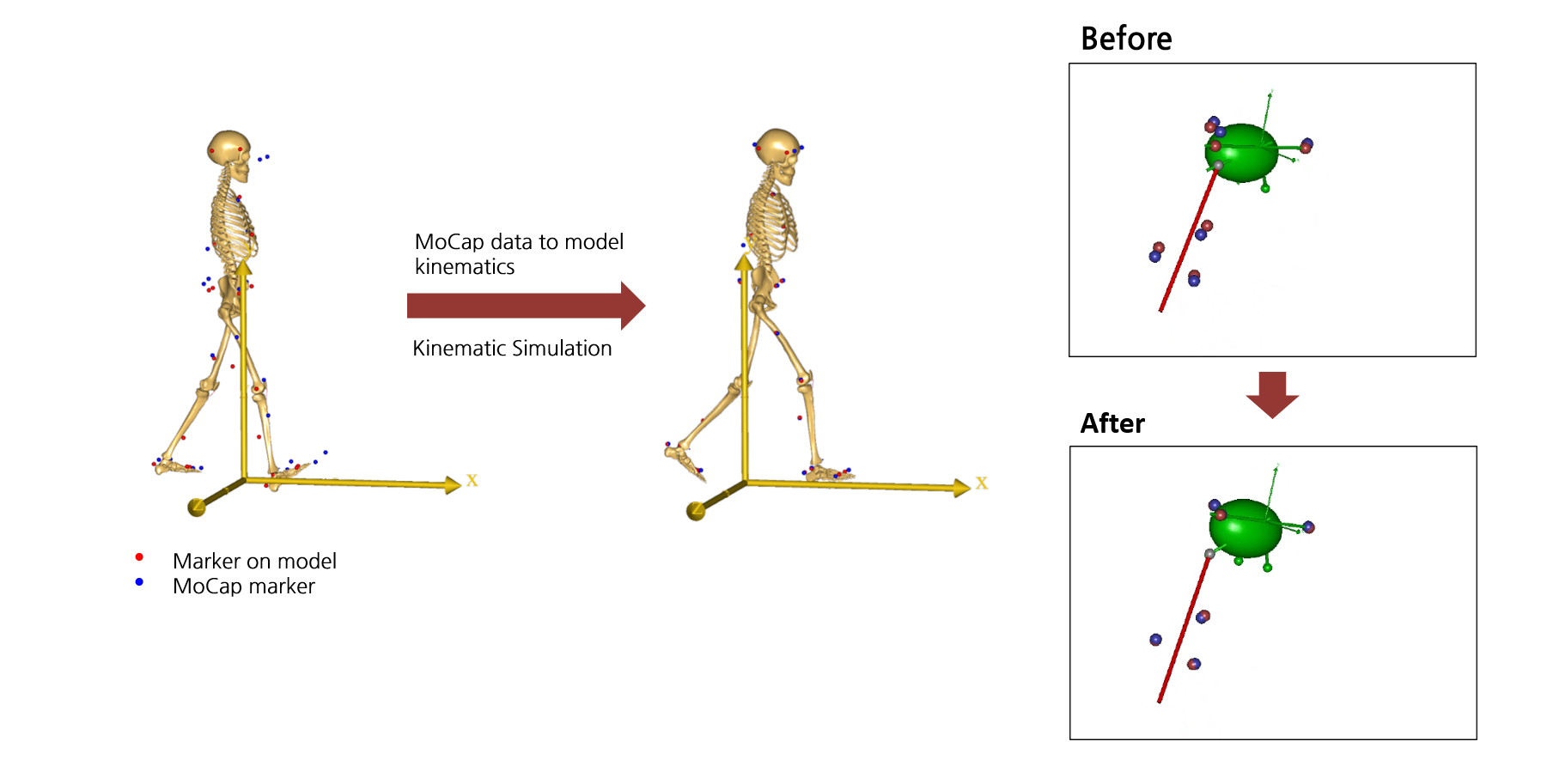 - 이때 AnyBody는 Parameter Identification 인 최적화 과정을 통해 Segment(뼈)길이 Marker의 부착위치를 여러번 반복 해석을 하면서 모션 캡쳐 데이터의 Marker 위치와 일치시키는 과정을 수행합니다.