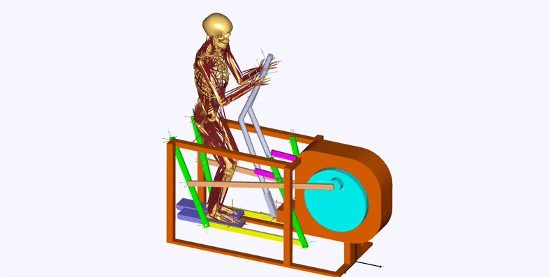 - 또한 아래와 같은 스쿼트 운동기구를 개발하는 경우엔 무릎 위치의 회전 스프링의 스펙을 결정하고자 할 때 AnyBody 시뮬레이션을 통해 스프링의 강성 파라미터에 따라 인체 모델의 근활성도 및 관절력 등의 결과를 확인하여 스프링 스펙을 결정할 수 있다.