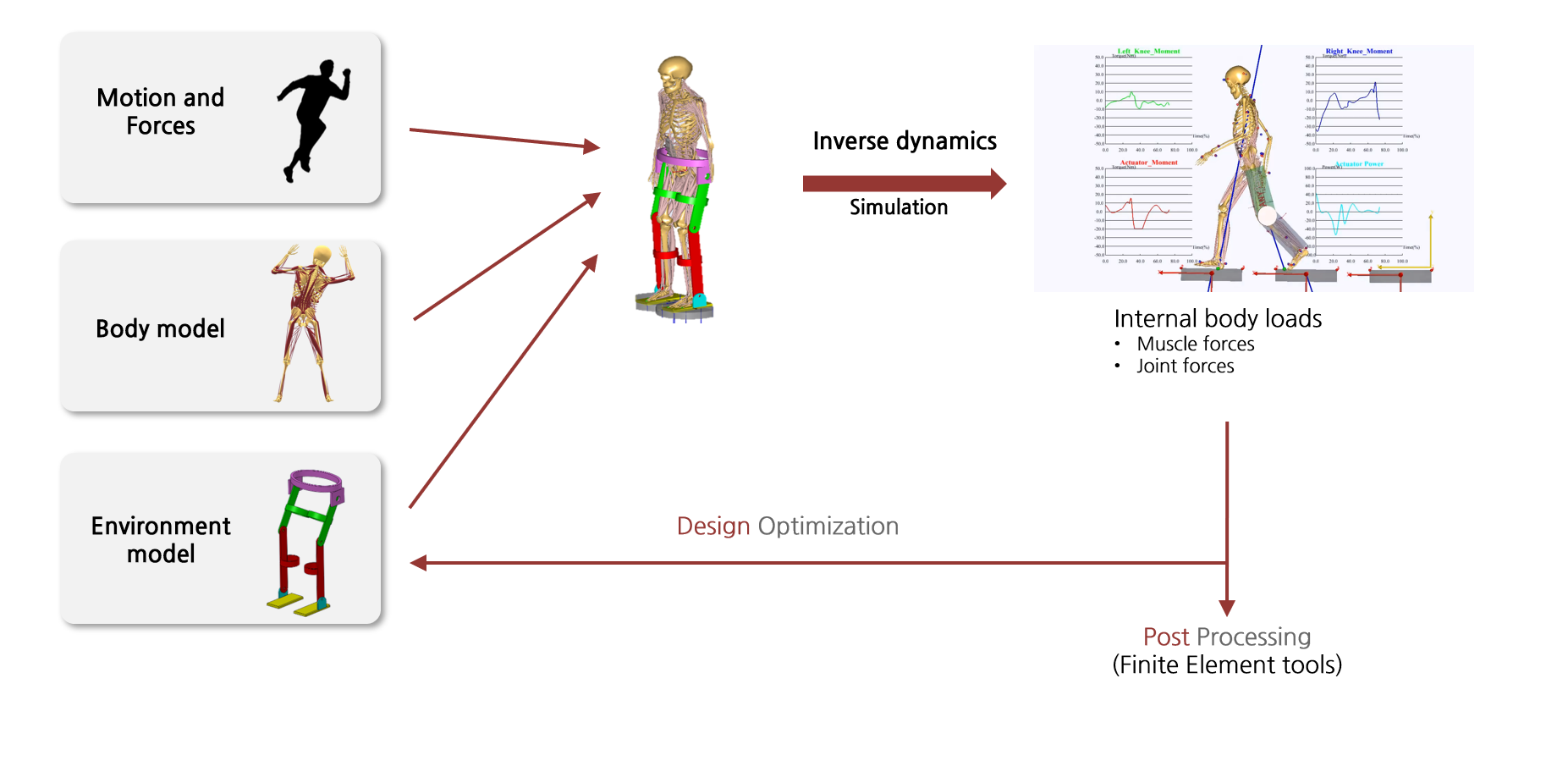 - AMS의 해석 프로세스는 주어진 모션과 힘, 인체모델, 그리고 인체모델을 제외한 외부 요소(Exoskeleton 등)을 통합하여 해석을 수행하여 인체모델의 관절력, 근력, 근활성도 및 신진대사에너지 등을 확인할 수 있습니다. 이 결과를 통해 제품의 설계변경과 최적화가 가능하게 됩니다.