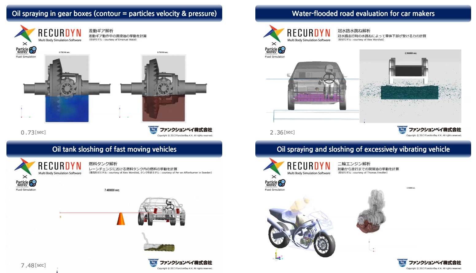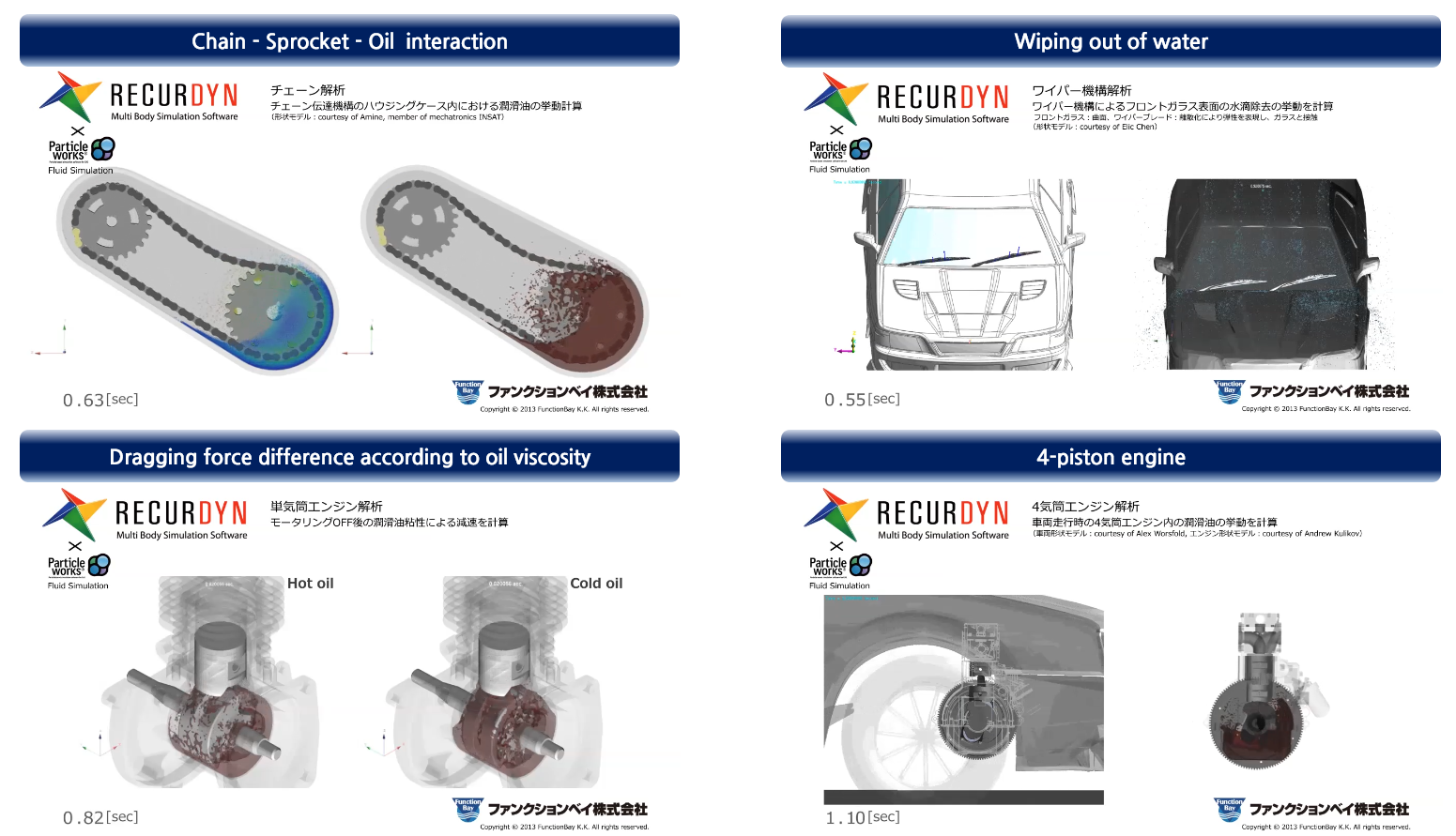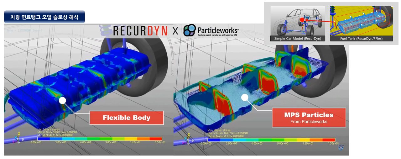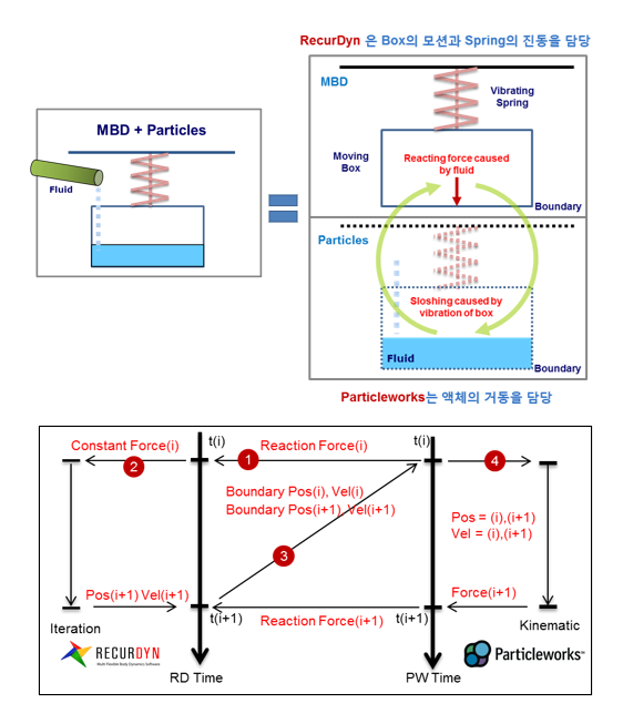 - RecurDyn 유연체 바디(FFlex, RFlex)와 Particleworks의 연성해석이 가능합니다. (Since RecurDyn V9R2)
