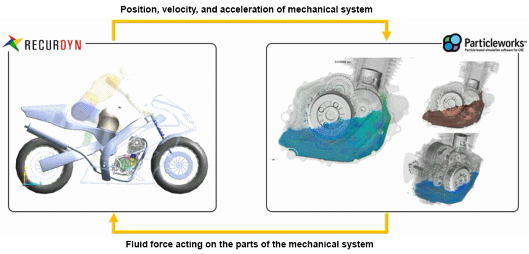 - RecurDyn 유연체 바디를 통해 계산된 변형이 Particleworks의 형상에 실시간으로 반영되며 RecurDyn은 Particleworks에서 계산된 유체력을 유연체 바디의 응력 및 변형의 계산에 사용합니다.