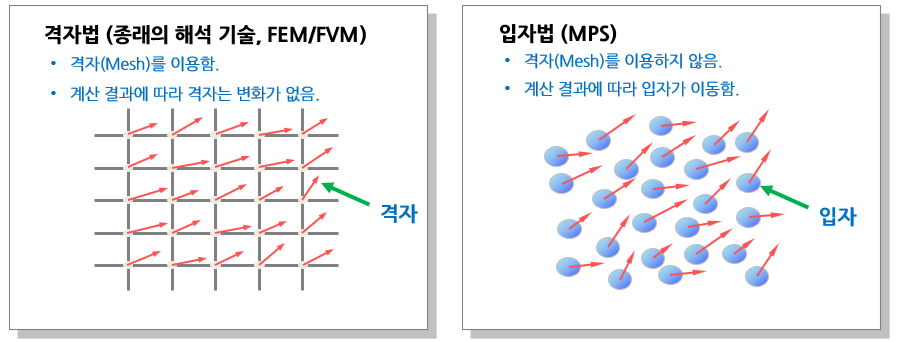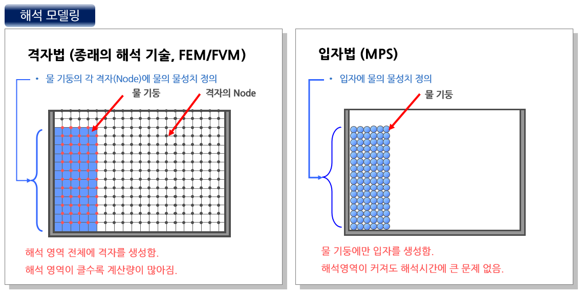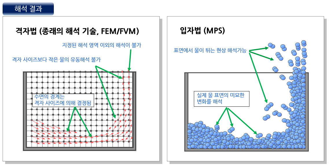- 유체를 입자로 표현함으로써 유체의 대변형이나 자유표면이 격렬하게 변화하는 현상을 쉽게 해석이 가능합니다.