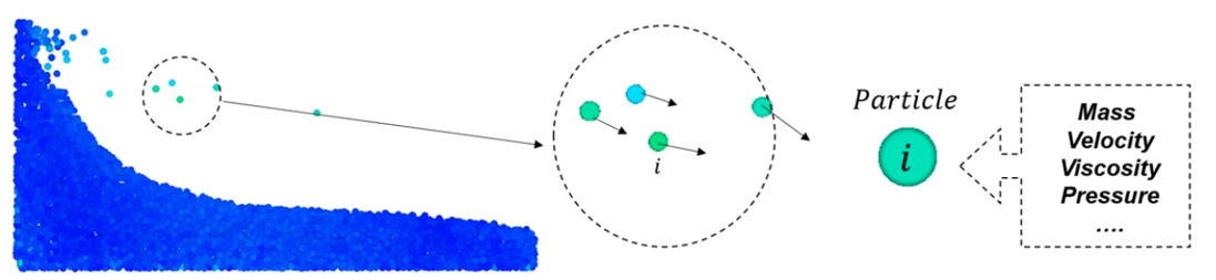 - 각 입자는 질량, 속도, 점성, 압력 데이터를 가지고 있으며 특정 영역에 들어오는 입자들을 탐색하여 상호 작용을 고려하기 위해 Navie-Stokes 방정식을 사용합니다.