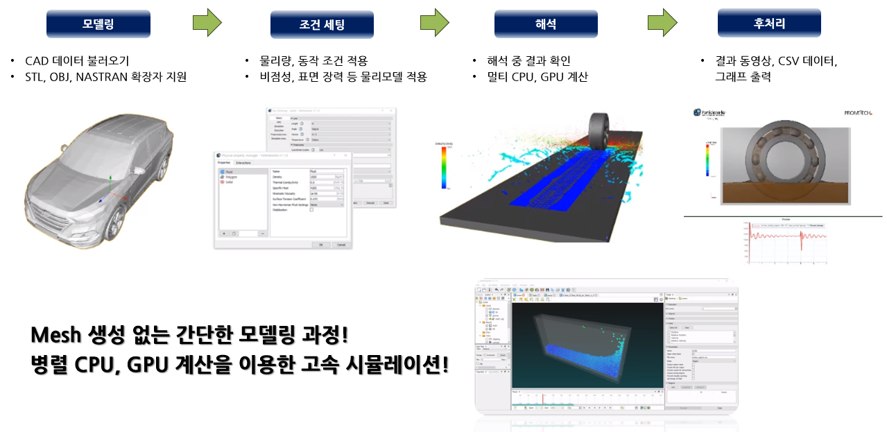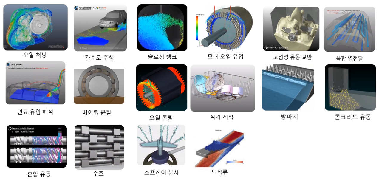 - 물, 기름 등의 액체를 입자를 이용하여 표현하고 대규모의 자유표면 흐름의 해석을 쉽게 수행이 가능합니다.