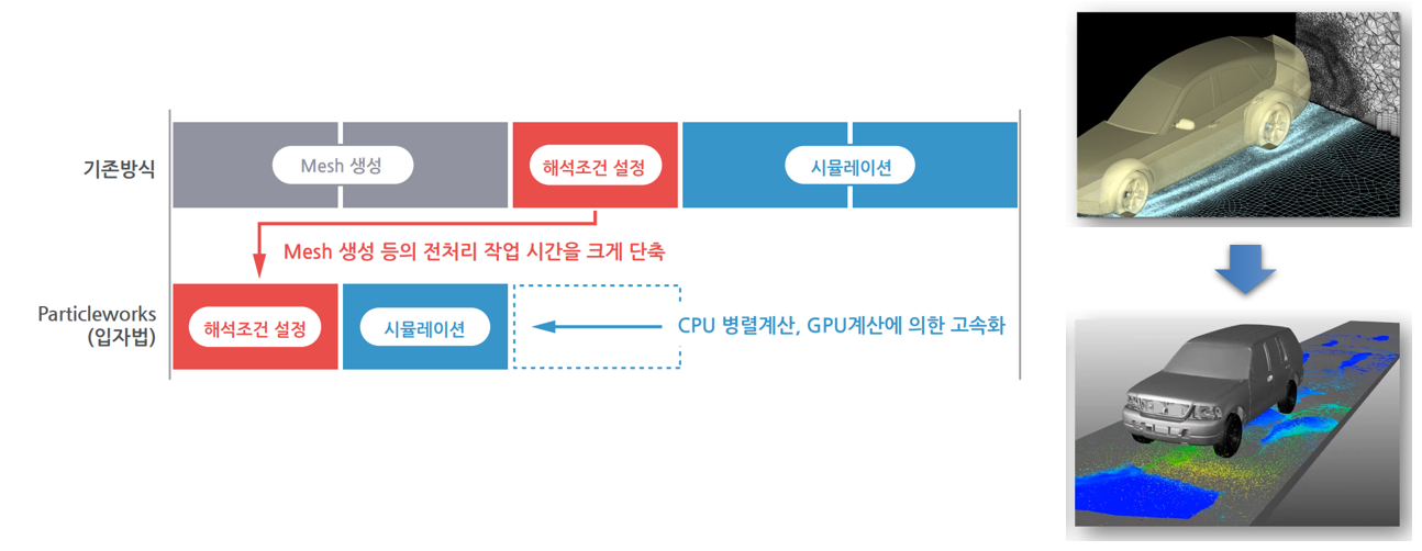 - Particleworks는 입자법(MPS)를 기반으로 한 Mesh Free 유체해석 소프트웨어