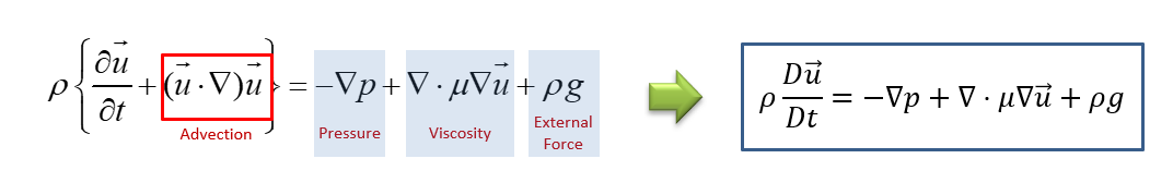 - 좌변의 이류항은 입자가 직접 이동하므로 고려하지 않으며, 우변의 압력, 점성, 중력 항을 계산하여 유체의 입자 속도를 계산합니다.