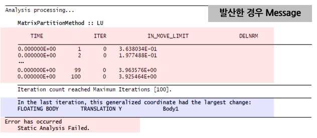 - 가장 큰 변화량(Largest Change)에 대한 내용을 확인하여 어떤 Body의 어느 자유도가 문제가 되는지를 검토하고 모델을 수정한 후 재해석 수행한다.