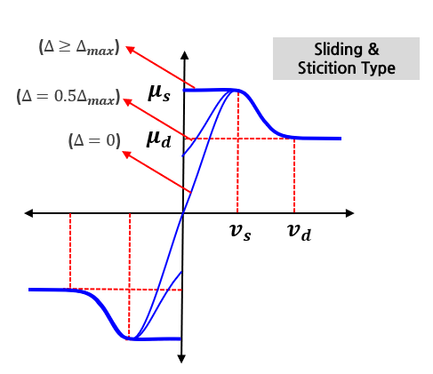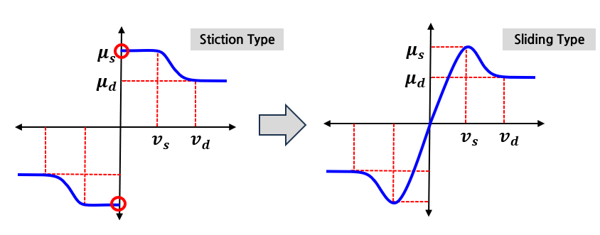 - 하지만 이론마찰 모델과 같이 상대속도가 0이더라도 바디는 움직이지 않아야 하지만, Stiction 타입의 그래프와 같이 정의하면 X축의 상대속도가 0일때, Y축의 값이 2개인 불연속 함수가 된다.