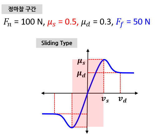- 이러한 불연속성을 수치적으로 안정적으로 계산하기 위해 Sliding 타입 그래프와 같이 기울기를 적용하여 마찰계수를 계산한다.