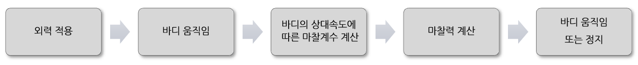 - 이후 외력이 동마찰력보다 작아지면 바디는 정지한다.