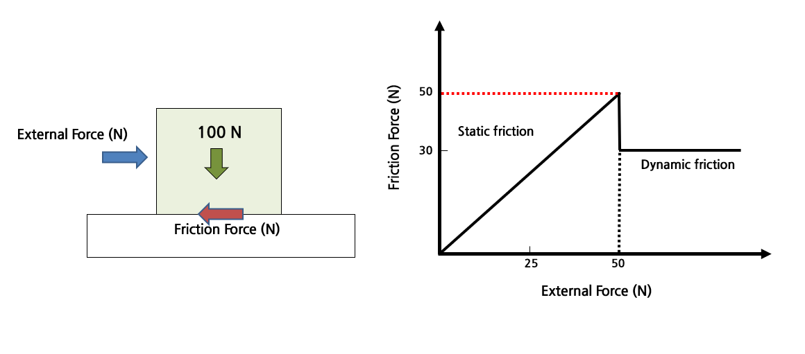 - 수직항력이 100N인 바디가 있는 경우, 정지마찰 계수(𝝁_𝒔)가 0.5이고, 동마찰 계수(𝝁_𝒅)가 0.3일때, 외력이 증가하여 최대 정지 마찰력 50N을 초과하면, 마찰력은 동마찰력(30N)으로 유지되며, 바디는 움직이기 시작한다.