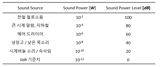 - Sound Intensity(음향 강도) : 단위 면적을 통과하는 단위 시간당 소리 에너지의 양