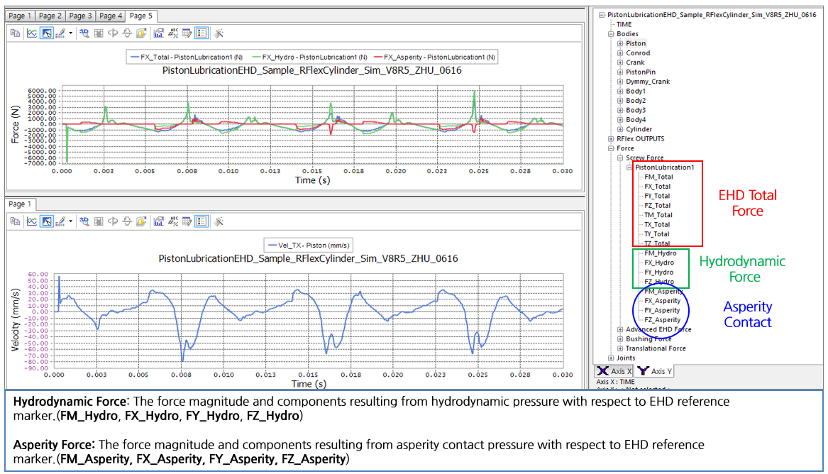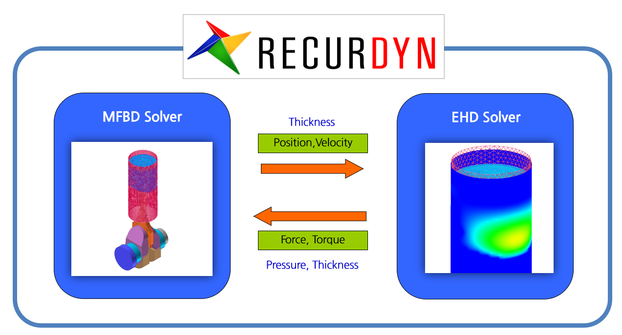 - MFBD 솔버는 시스템의 동역학을 수행하여 위치와 속도 데이터 및 힘, 토크, 압력, 두께 정보를 EHD솔버로 전달합니다.