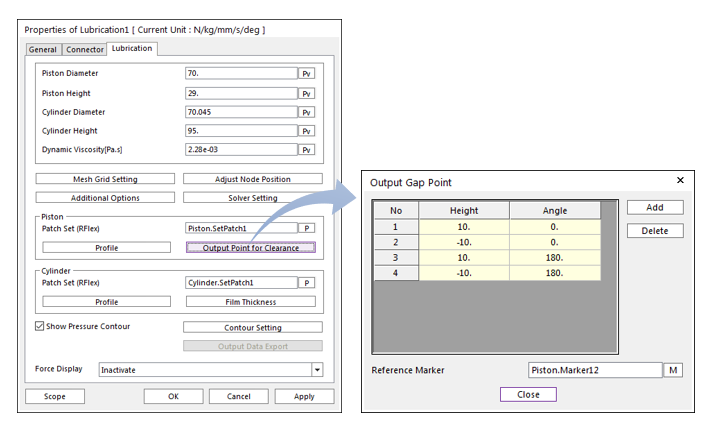 - Output Point for Clearance: 동작 중에 사용자가 지정한 피스톤 상의 지점과 실런더 사이의 틈새 크기를 출력