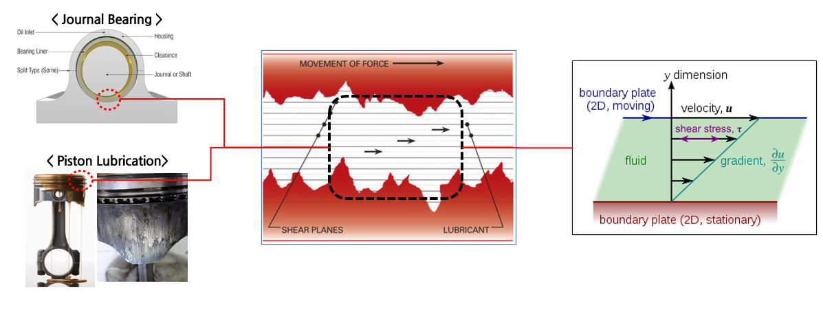 - 베어링-저널의 고속 회전운동, 피스톤-실린더의 고속 병진운동에서 접촉면에 대한 윤활효과를 정의하고, 윤활막의 두께 및 압력변화 예측으로 윤활 최적화가 가능하다.